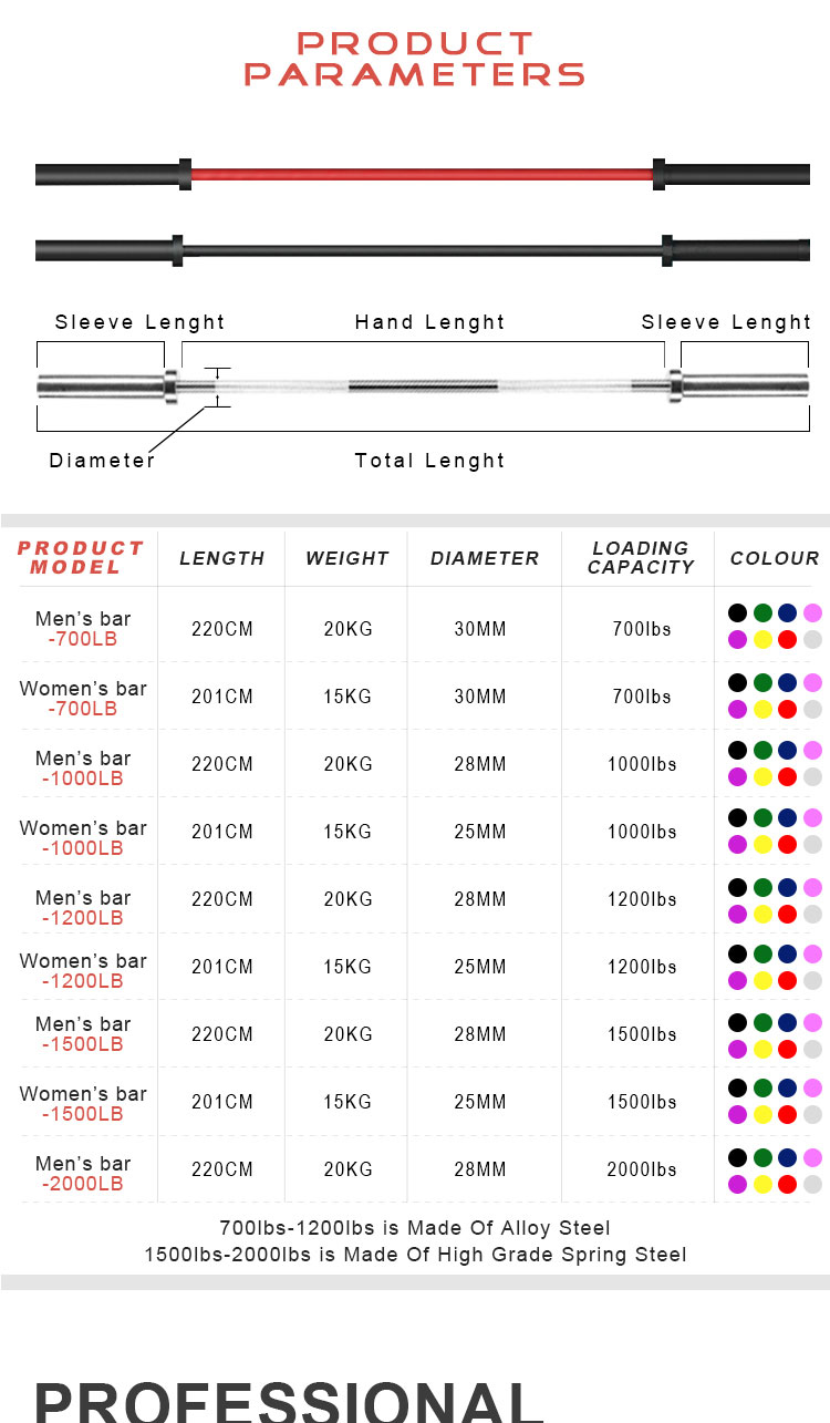 This professional barbell is suitable for various fitness training scenarios, including strength training, weightlifting, and CrossFit. It is an ideal choice for gyms and professional athletes alike.
